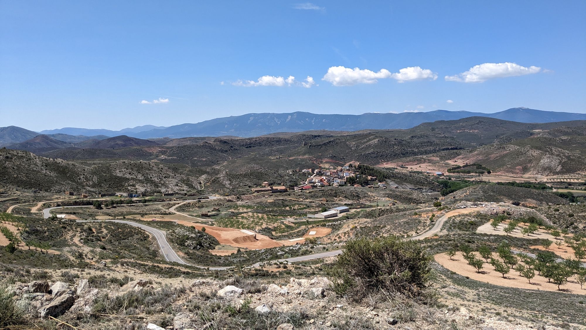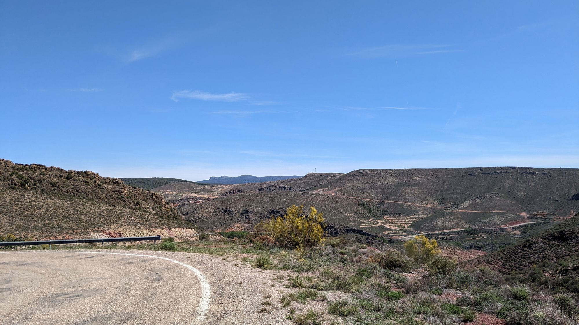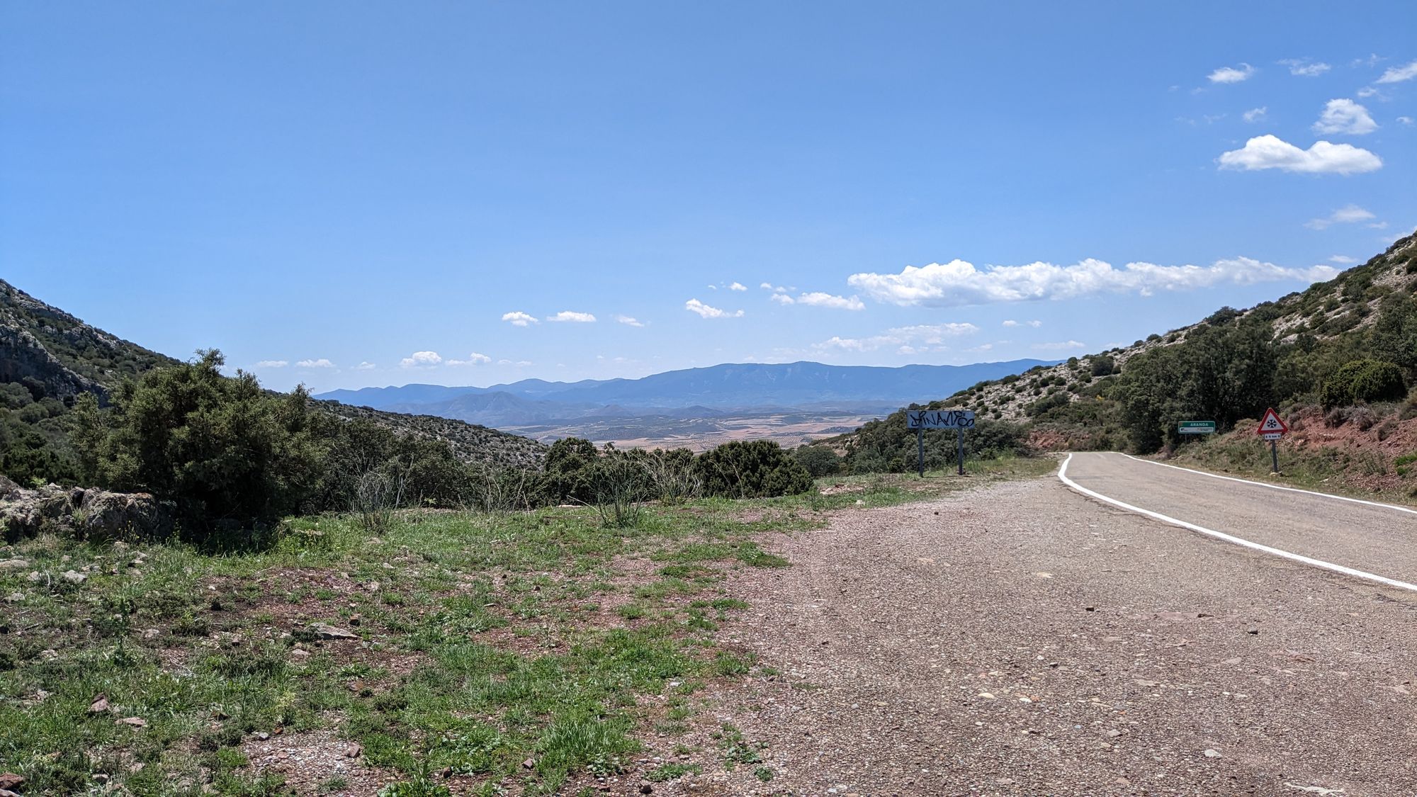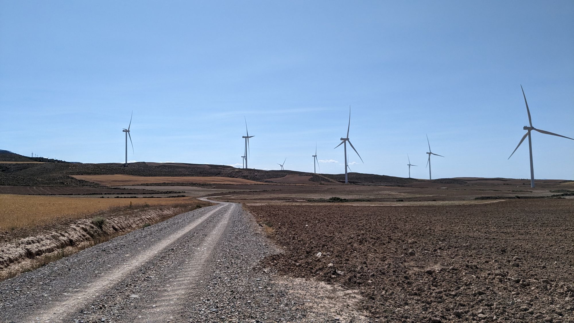 Heute weiche ich das erste Mal von der Originalroute ab, das sieht mir nach zu viele heftigen Anstiegen auf Schotter aus. Auch sind nach drei Sonnentagen heftige Gewitter Tage angekündigt. Bis dahin will ich es nach San Sebastian schaffen und besonders die Bardenas Reales wenigstens ohne Regen durchqueren. Ich weiß nicht ob es überhaupt geht nach dem vielen Regen, aber bei den angekündigten Unwettern gar nicht. Aber wie es so ist, langweilig ist es nicht. Zwei Berge, Schotter mit brutalen Gegenwind (Nordeseeküste lässt grüßen) durch ein Windfarm. Ja warum ist die da nur? Das ganze wenigstens mal bei 30+ Grad und knalliger Sonne.